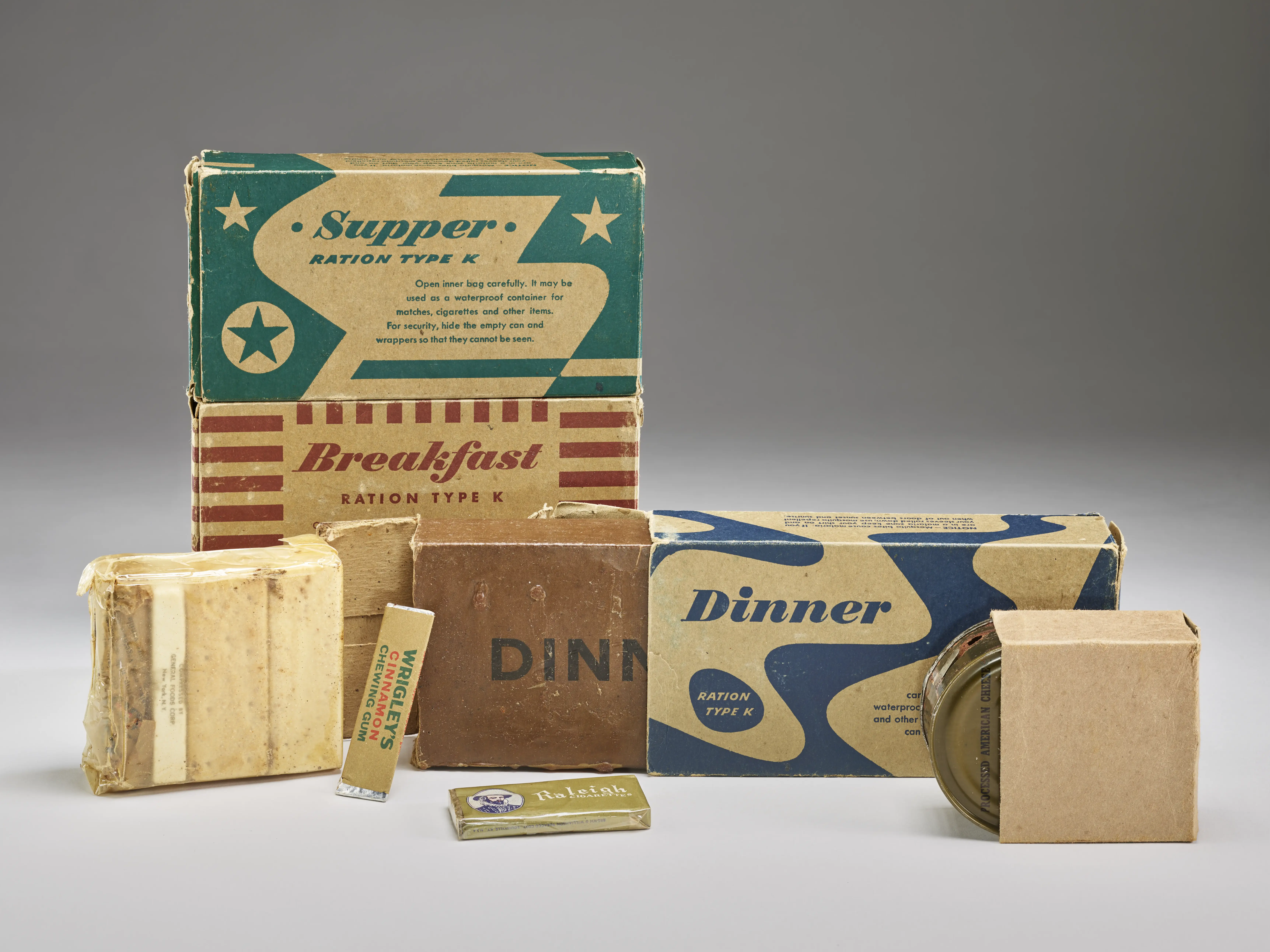 Dieses Frühstückspaket der Luftlandetruppen der United States Air Force aus dem Jahr 1942 ist in einem besonders luftdichten Wachskarton verpackt, der für eine längere Haltbarkeit des Inhalts sorgte.