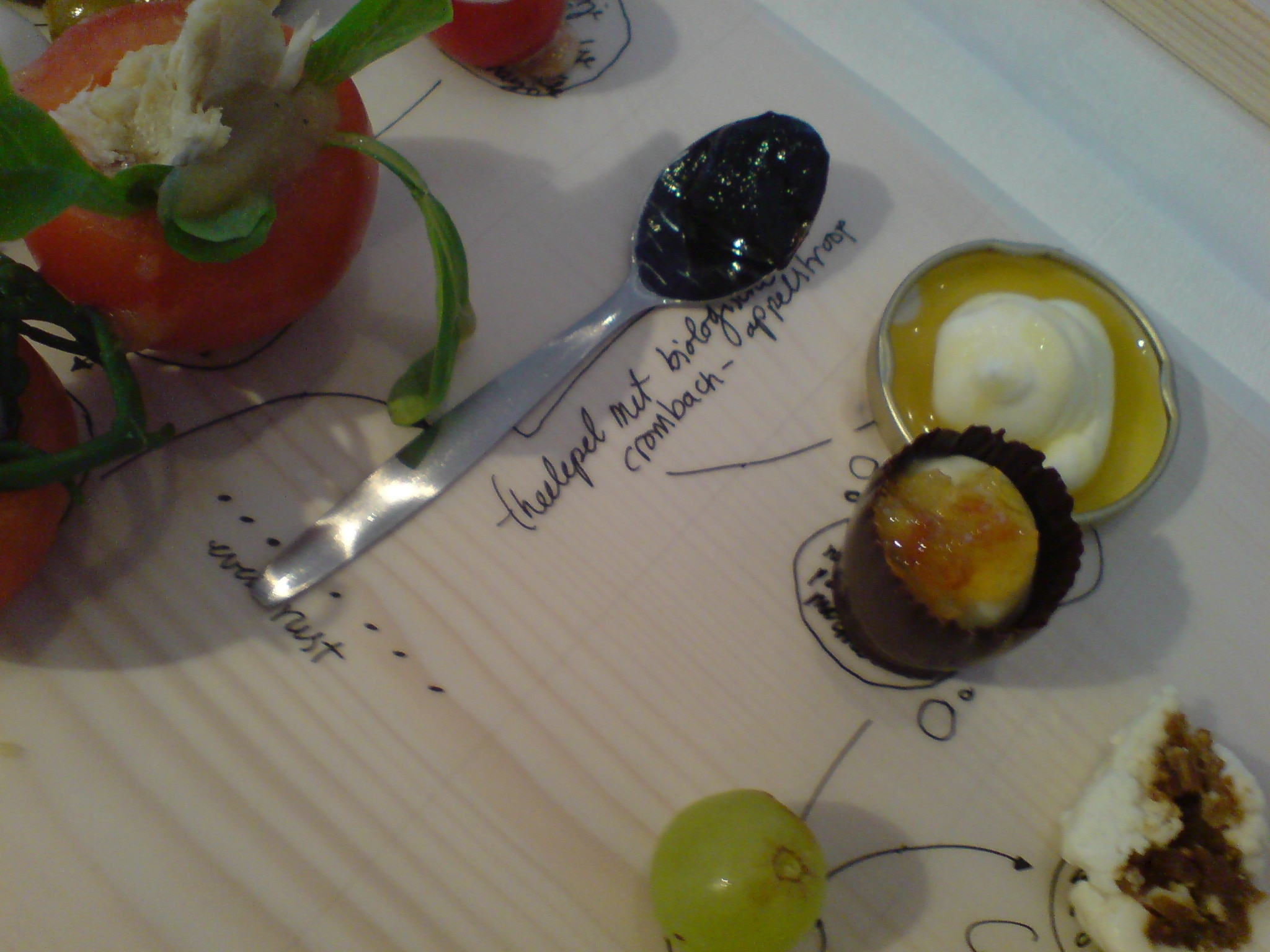 Ein Gericht ist eine Komposition. Geschmacksnoten sind Musiknoten. Wenn man sie kombiniert und ihnen Raum und einen Rhythmus gibt, entsteht daraus im Mund ein „musikalisches Meisterwerk“. Zum Takt einer Trommel essen die Gäste die Häppchen in einer festgelegten Reihenfolge.