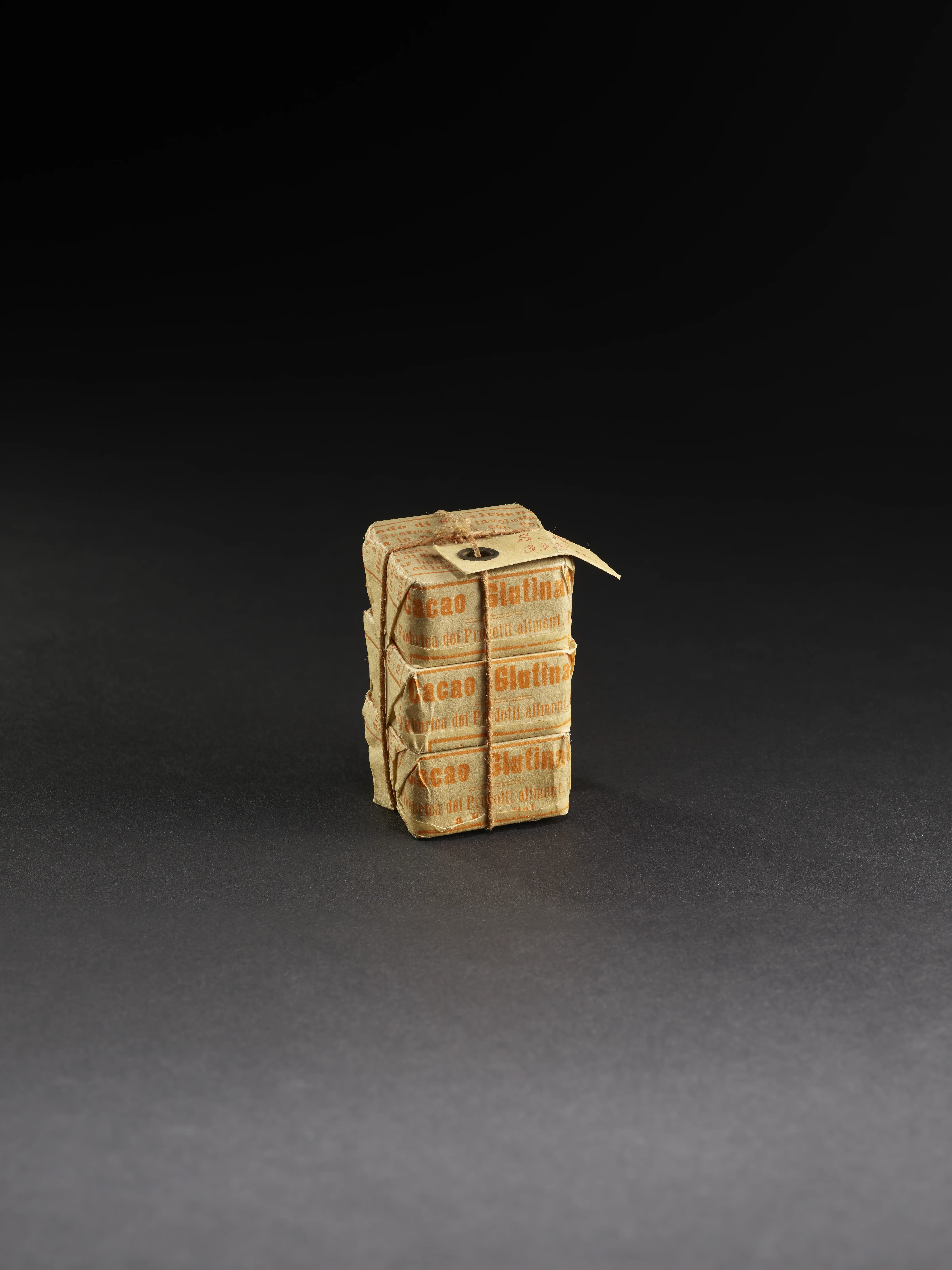 Glued to the underside of these three small Cacao-Gluten tablets linked by a string, a white label indicates ‘for display’, letting us know that they were not intended for consumption but for displaying Maggi products in shop windows. The small label threaded through the string bears the enigmatic handwritten inscription ‘S IV / 336 / et’.