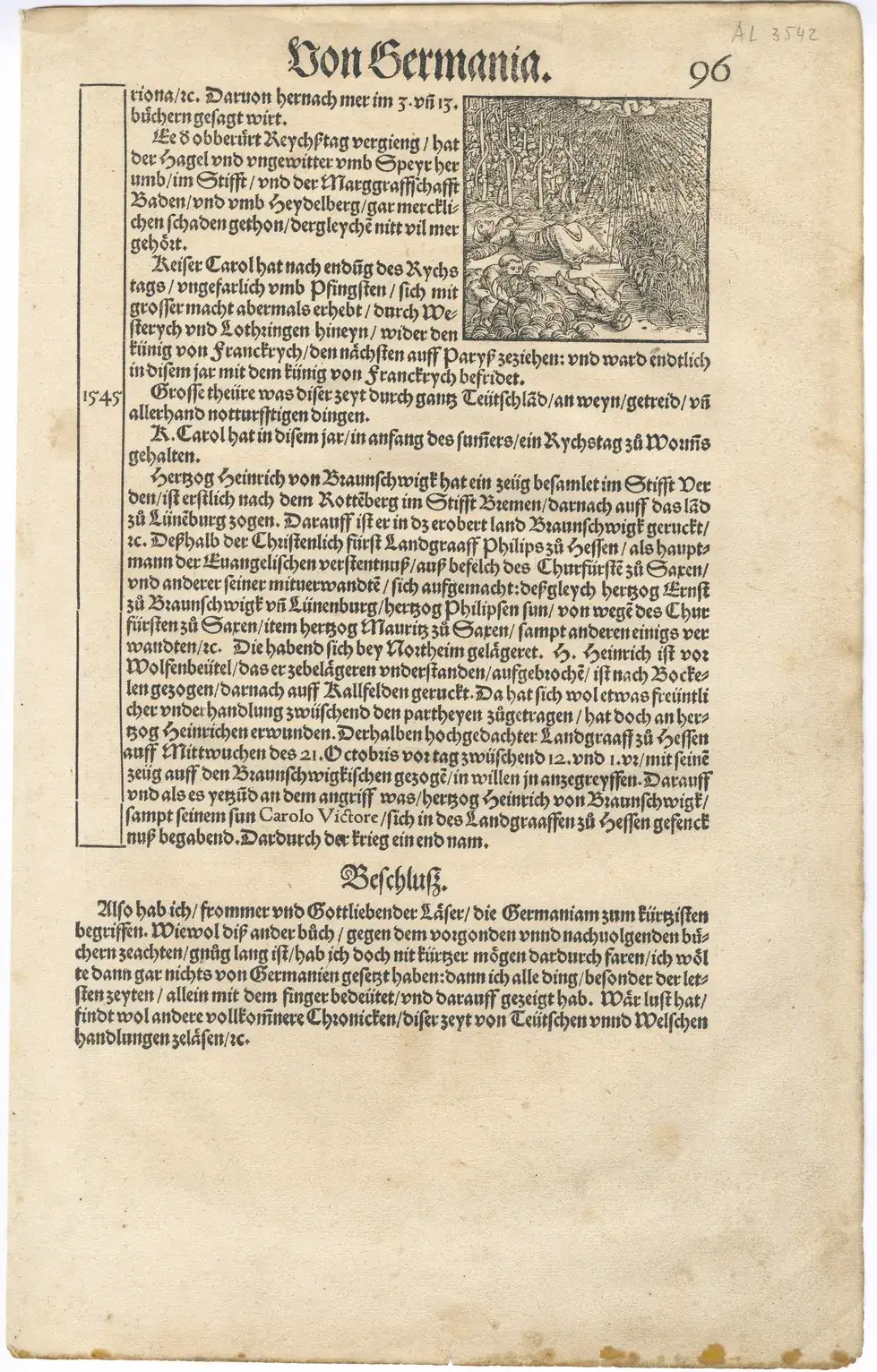 This engraving appeared several times in Johannes Stumpf's 'Chronicle of the States of the Swiss Confederation'. In particular, it depicts a hailstorm that hit Switzerland in 1437 and a similar event that occurred near Baden in Germany in 1544. The scene clearly depicts hailstones falling on a starving population, emphasising the dramatic impact of such natural disasters.