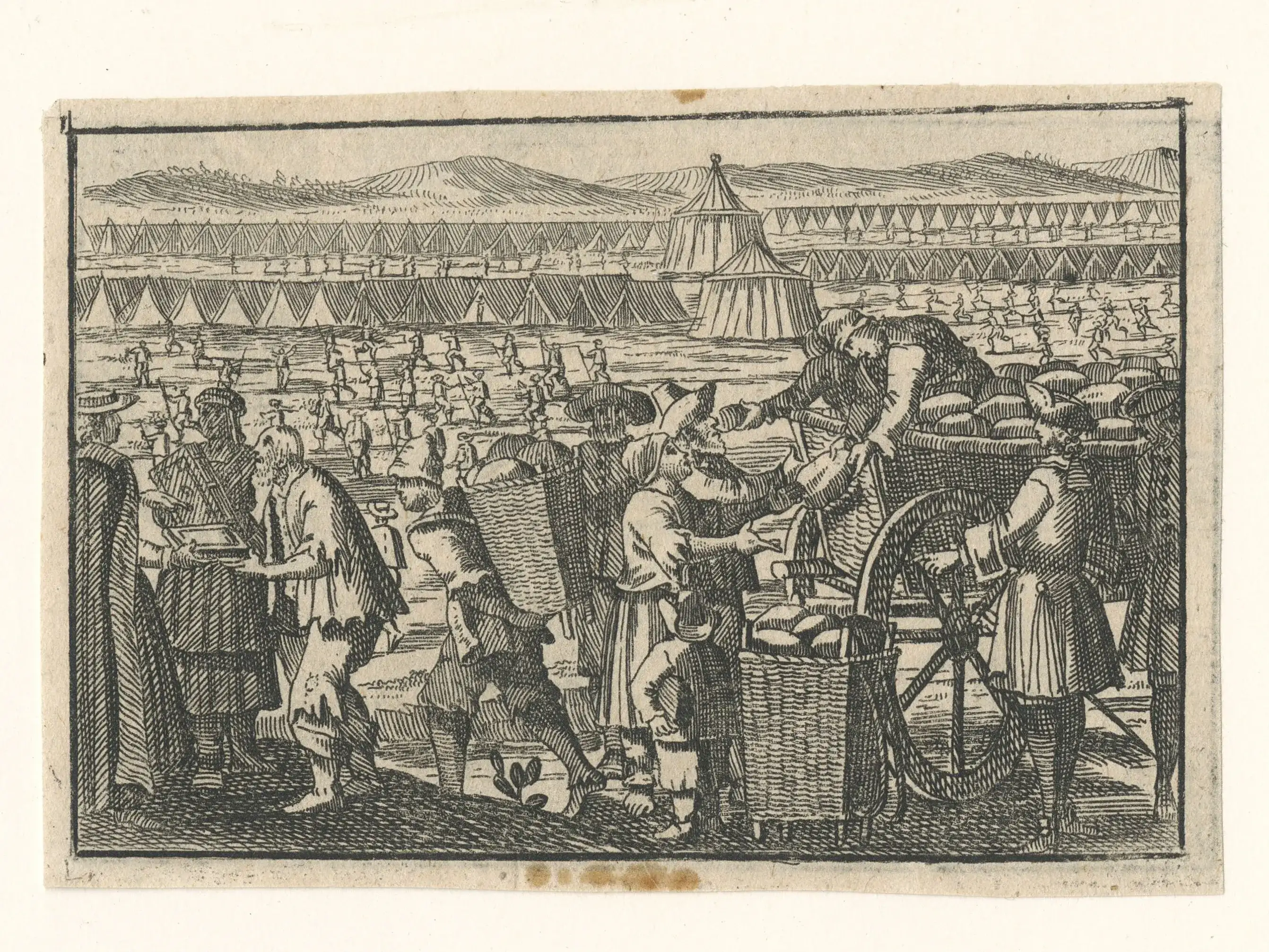 Engraving showing the distribution of bread to German refugees arriving in England in 1709