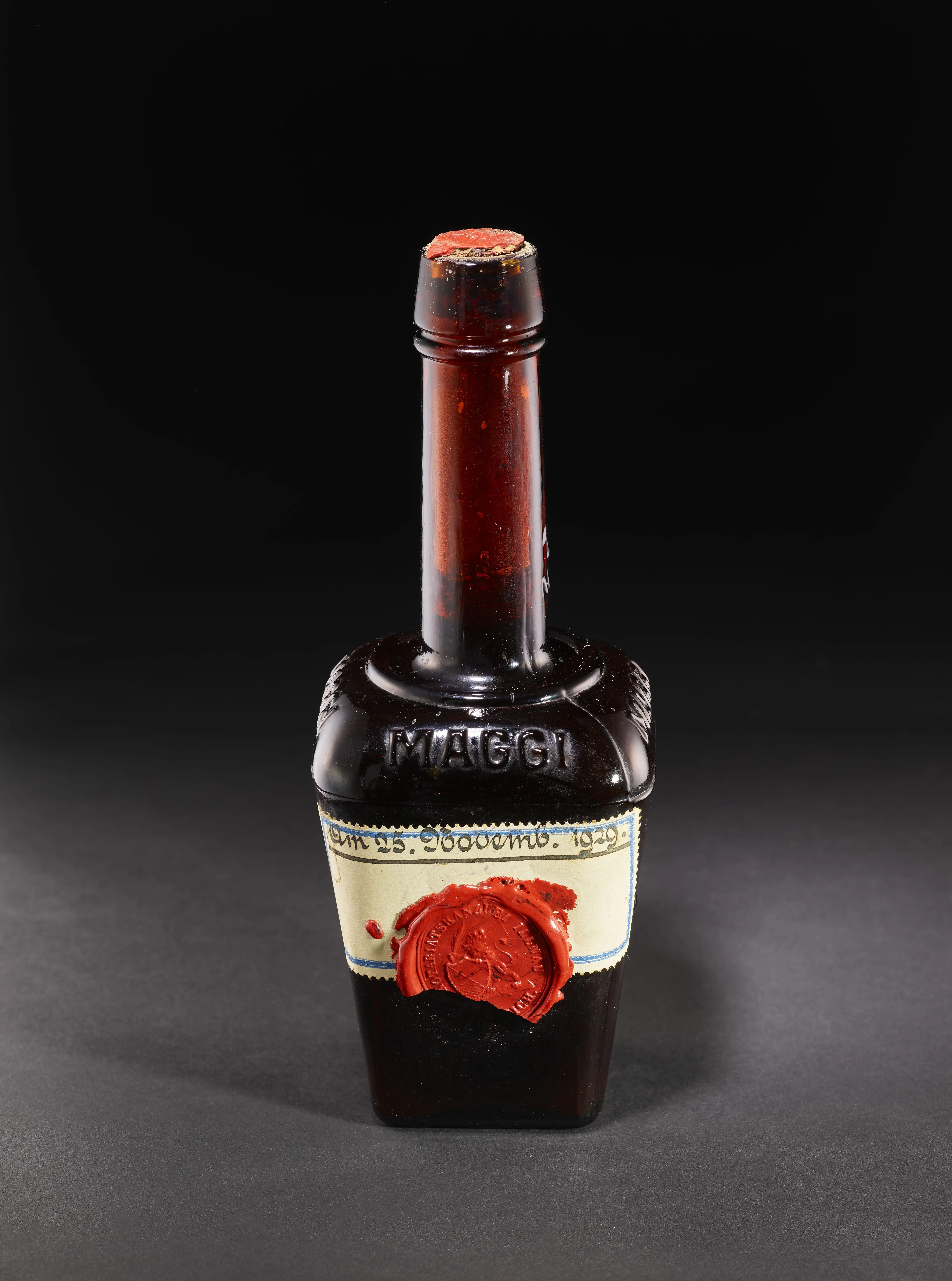 Counterfeiting and adulteration were commonplace in the early days of the food industry. It was all the easier for products such as Maggi-Aroma to be sold in bulk by traders who might be tempted to adulterate or dilute them. This explains why this bottle of Aroma bears a label with the date November 25, 1925 and the imprint of a notary's seal in red wax. Samples of this type were taken at Maggi's request right up to the Second World War for testing at the cantonal laboratory in Zurich.