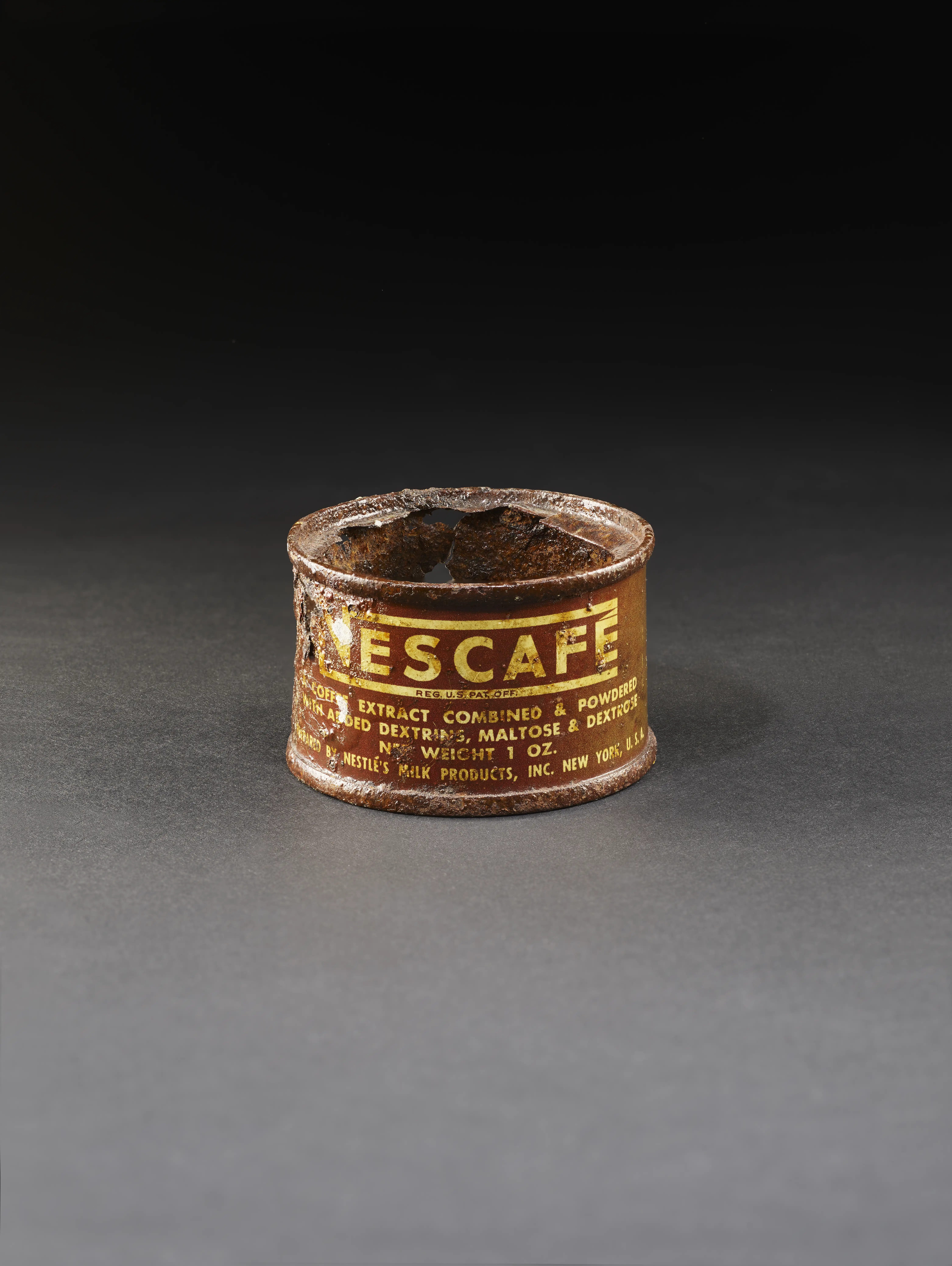 This box landed with the GIs in Normandy in 1940! It was found in 1948 at the Pointe du Hoc, one of the landing points for the American army during the Second World War. It's a symbol that sums up the history of this product, launched in 1938 in Vevey, but which owes its real success to the United States, where it was marketed, and even produced, from the early 1940s. The Second World War was a good time for it, as its long shelf life meant that it was adopted for supplying the American army. After the Liberation, GIs widely distributed the tin cans of Nescafé that remained in their packs along with cigarettes or chewing gum to Europeans they came across, contributing to the product's growing popularity.